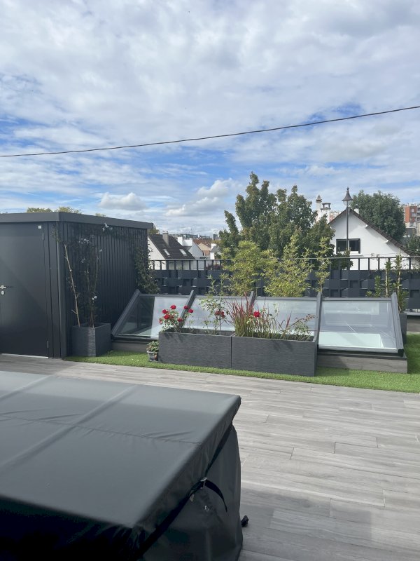 Au premier, un étage qui peut devenir indépendant pour un adolescent, une fille au paire, ou des amis de passage se compose d'une chambre, d'une salle d'eau, d'un salon avec cuisine d'appoint donnant sur un roof-top de 60 m² avec abri de jardin.