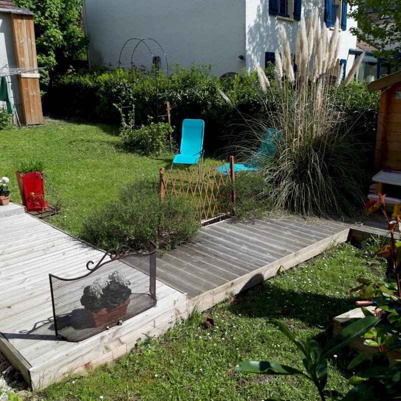 RdC: 1cuisine ouverte sur 1x Salle à manger, 1x Grand Salon donnant sur terrasse, 1x WC séparé, 1x Dressing, 1x Buanderie donnant sur jardin.