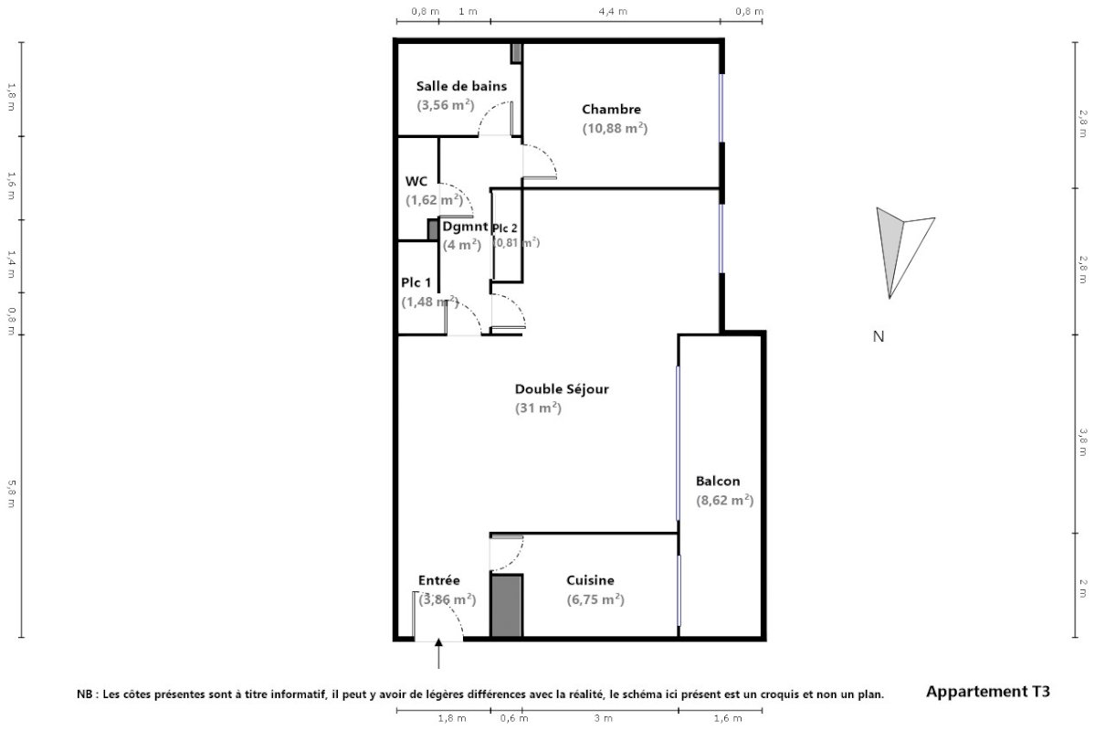 - un double living ouvrant sur le balcon de 8.62 m2 (possibilité d'une deuxième chambre de 11 m² dans le séjour car la porte existe déjà pour accéder à la partie nuit),