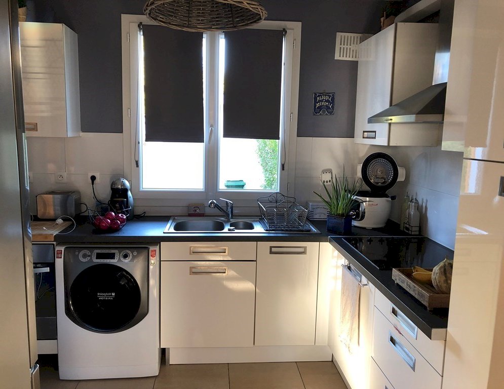 Entièrement refaite à neuf, garage privatif, chauffage gaz individuel, cuisine meublée.