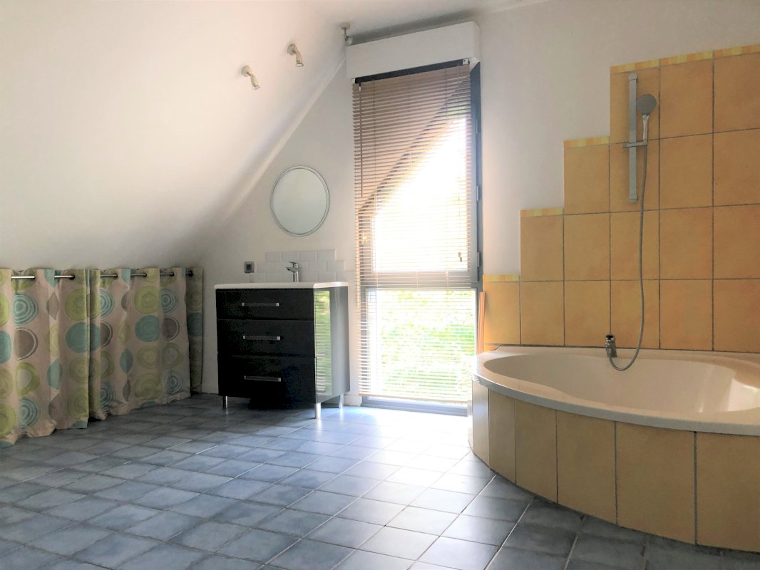 1 salle de bains avec des rangements et la possibilité d’y aménager un dressing.