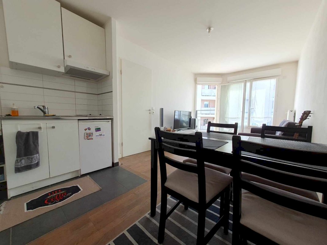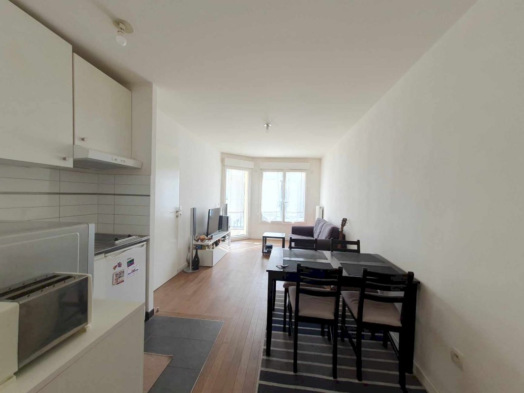 Pièce à vivre avec cuisine ouverte (emplacement lave-vaisselle) et accès terrasse.