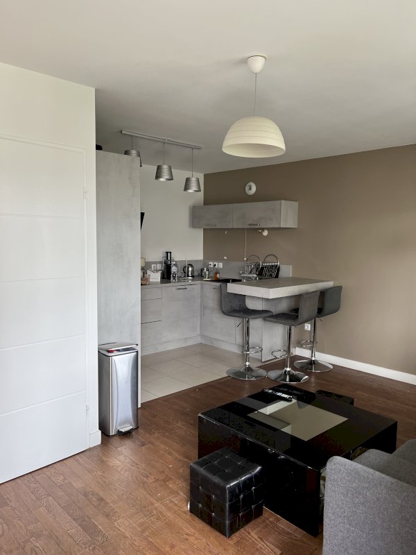 -Une entrée avec son WC invités ; Salon/sejour/ cuisine aménagée et équipée ; Une table bar complète la partie cuisine.