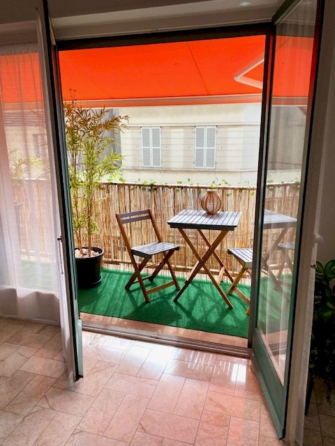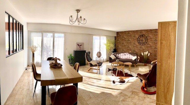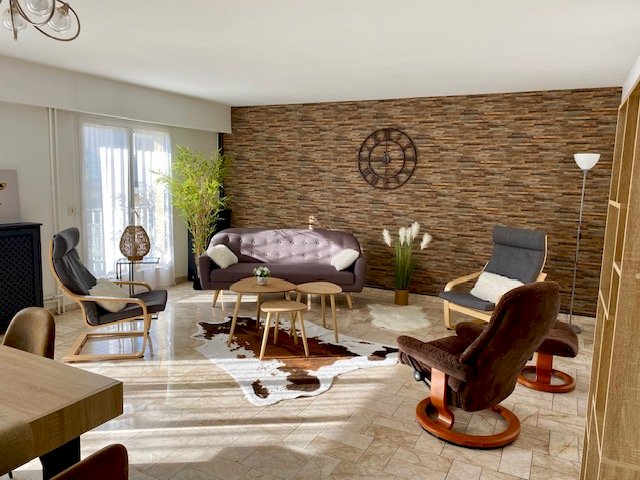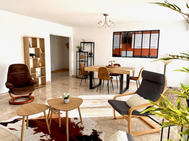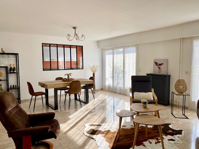Pièce à vivre (double séjour) de 32m2 avec balcon filant sur toute la longueur. Stores bannes électriques neufs.