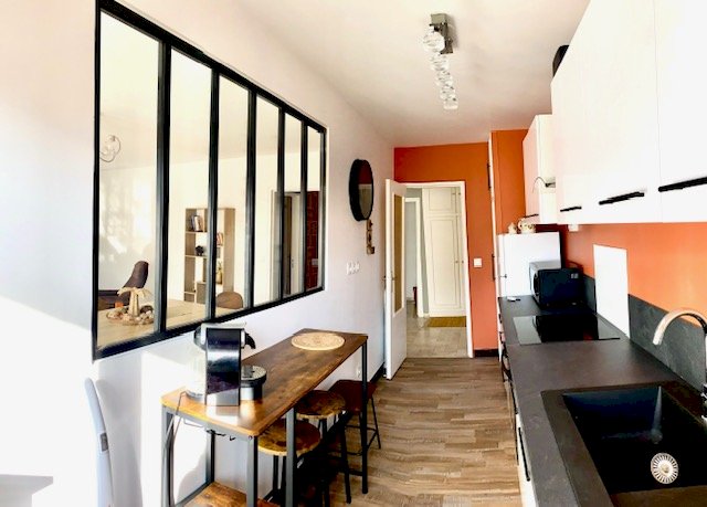 Cuisine fermée avec verrière donnant sur le salon. Possibilité d'ouvrir sur le salon pour cuisine ouverte faisant une pièce de plus de 40 m2.