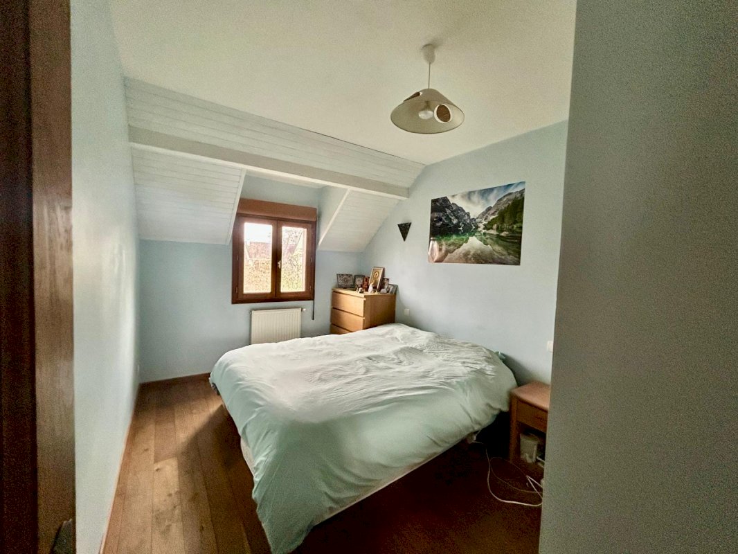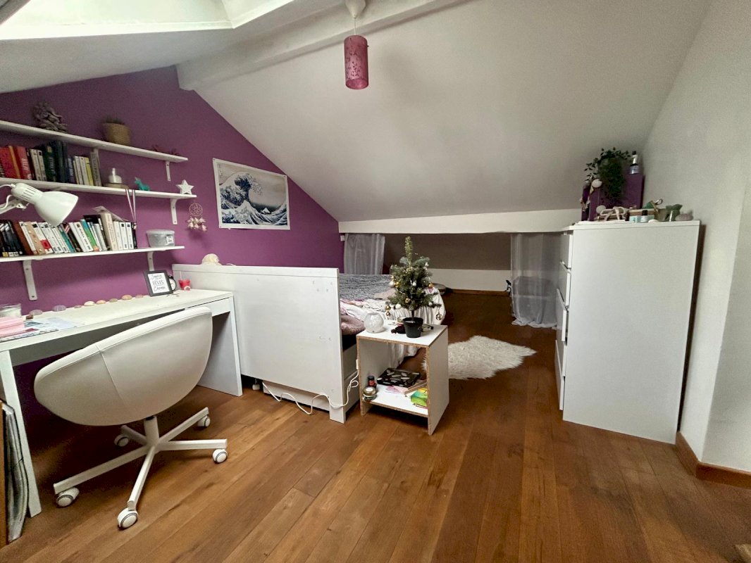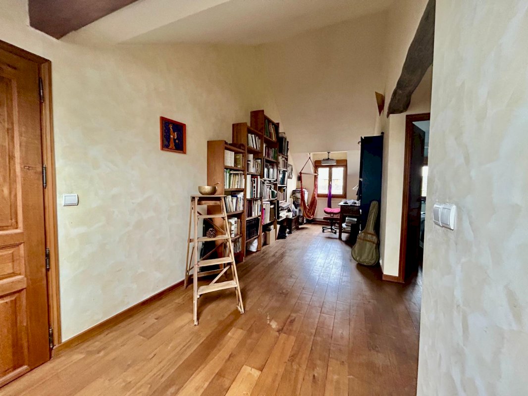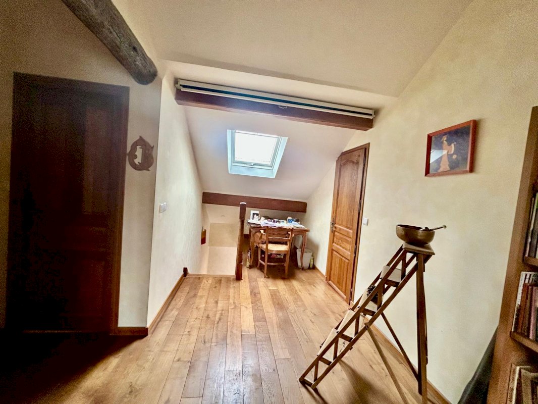 A l'étage : un grand dégagement de plus de 20m², deux chambres avec placard et aménagement de rangements, une salle de bains avec wc.