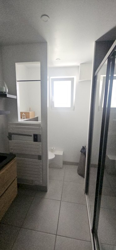 Au rez-de-chaussée bel espace salon/salle à manger et radiateurs à inertie, cuisine ouverte toute équipée offrant un espace convivial communiquant avec l'extérieur, une chambre/bureau, une salle de bain et w.c .