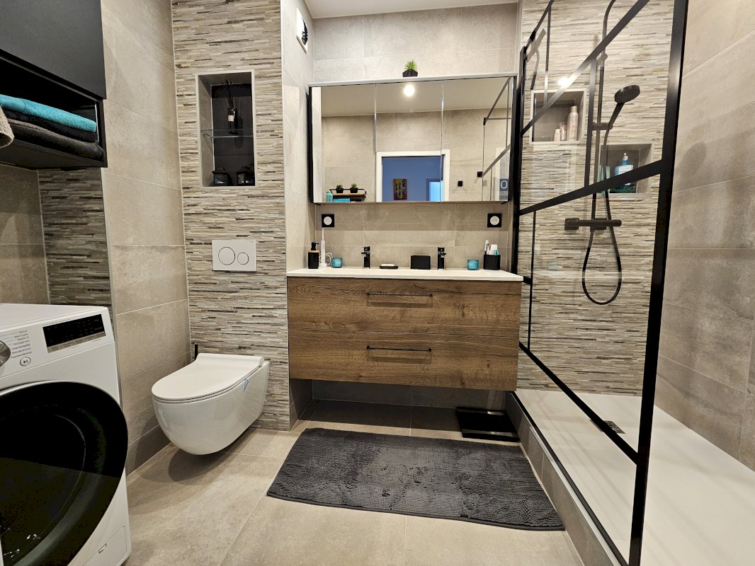 La partie nuit se compose d’une chambre avec placard aménagé ainsi que sa salle de bains, une autre chambre avec grand placard, une salle d’eau avec une grande douche et un 2nd WC.