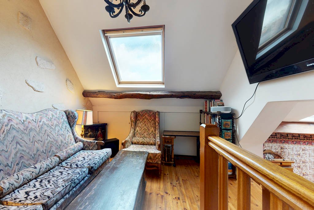 - Accès par séjour au 2e étage mansardé, avec parquet et poutres apparentes, vers salon (ou chambre), communicant vers chambre (ou bureau) en mezzanine, avec espace visuel du vide devant mezzanine exploitable, ouvert sur bureau. Grands rangements en sous-pentes.