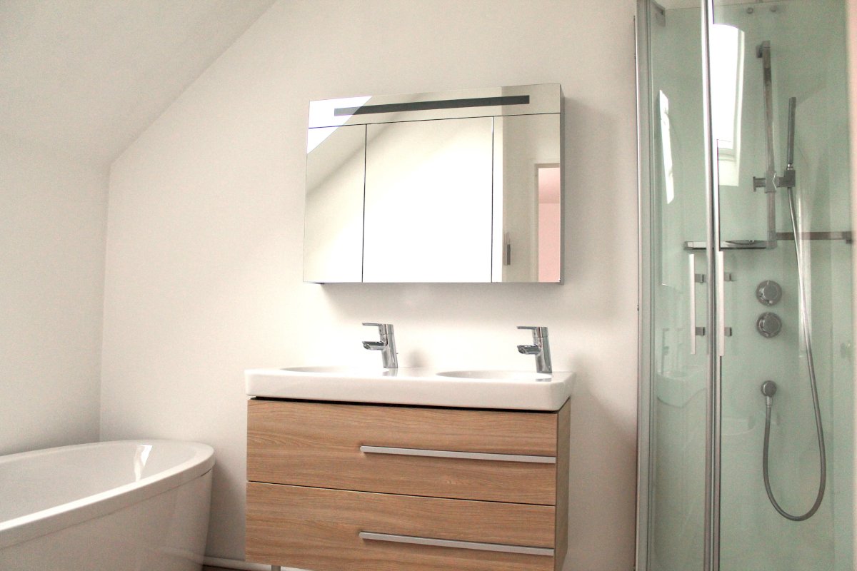 A l’étage, cinq chambres confortables, qui chacune bénéficient d’un placard intégré. La suite parentale dispose d’un dressing et d’une salle de bain/douche avec toilettes. Les autres chambres sont desservies par une salle de bain et toilettes séparées. L’ensemble de l’étage est parqueté de chêne massif.