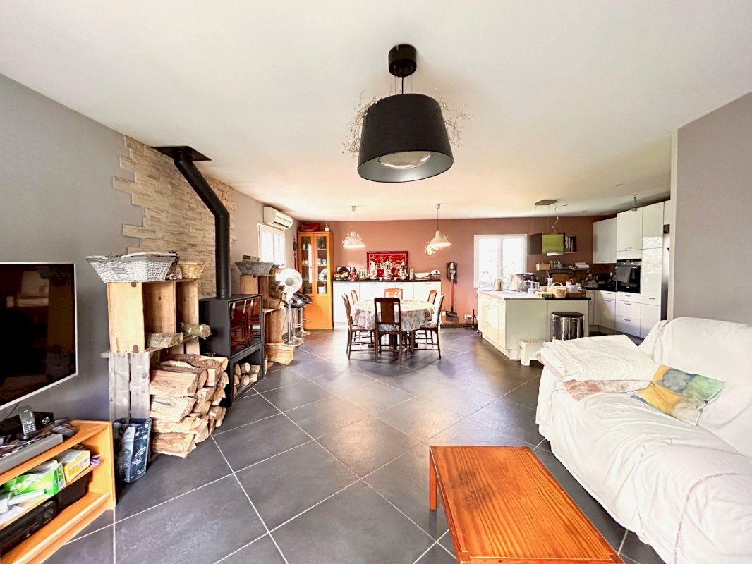 Belle pièce de vie traversante de 42 m² (salon/salle à manger avec poêle à bois)