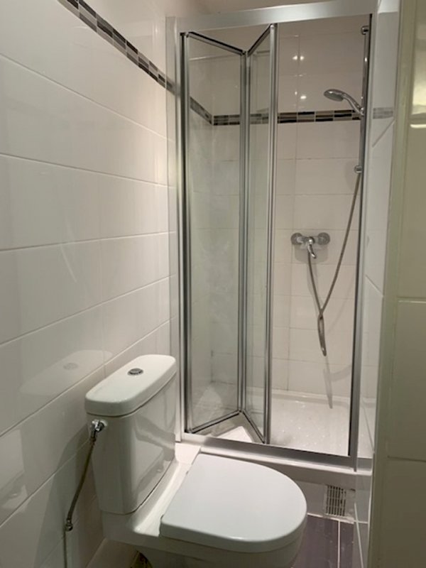 Salle d’eau moderne en parfait état avec douche, wc, lavabo et lave-linge.