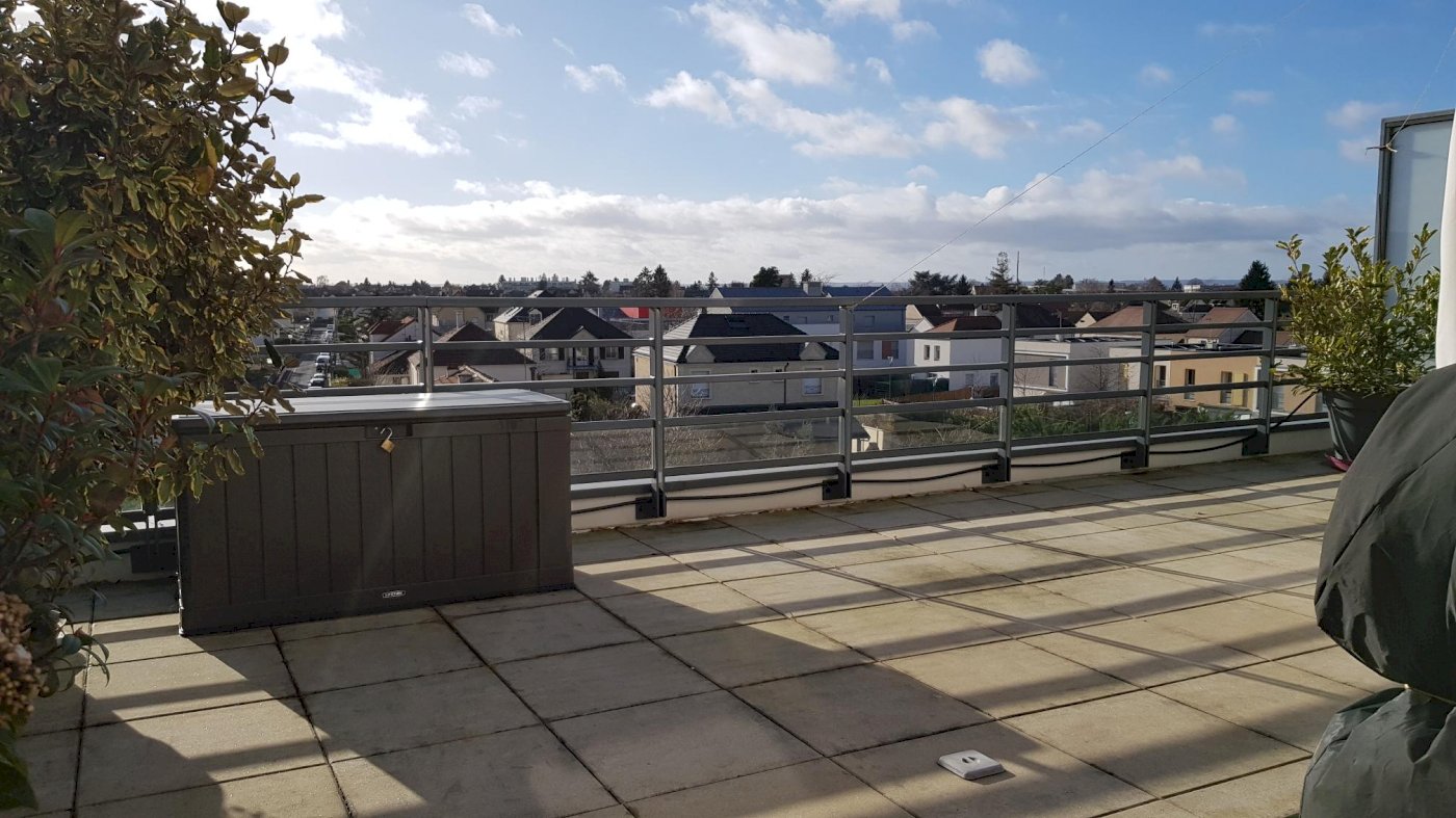 terrasse aménagée de bacs à plantes et d’une armoire de rangement, laissés à disposition