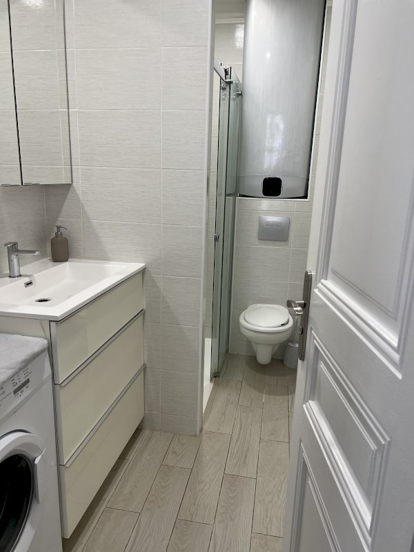 Salle de bain avec douche WC, machine à laver puis cuisine équipée, tout l équipement restera.