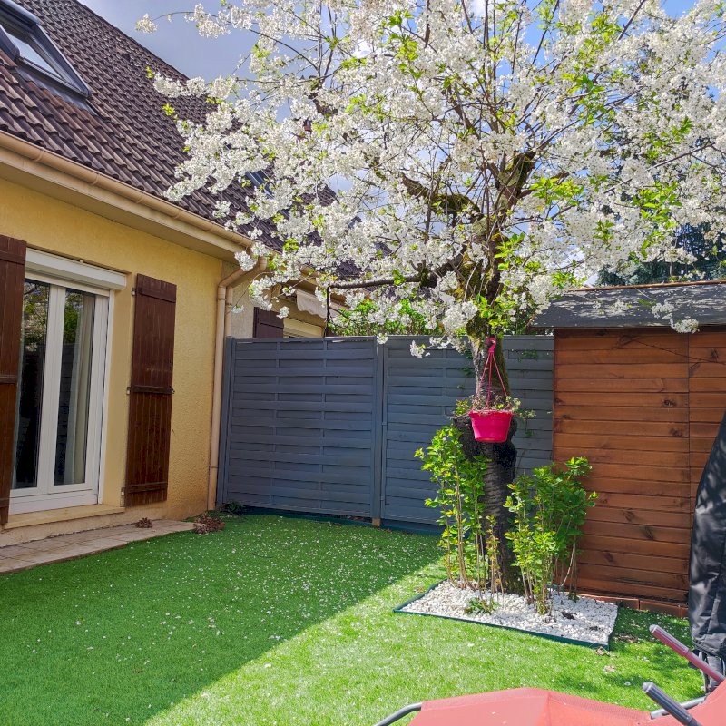 - Extérieur : jardin avec cabane et cerisier, terrasse devant la maison, emplacement véhicule supplémentaire dans l'allée du garage.