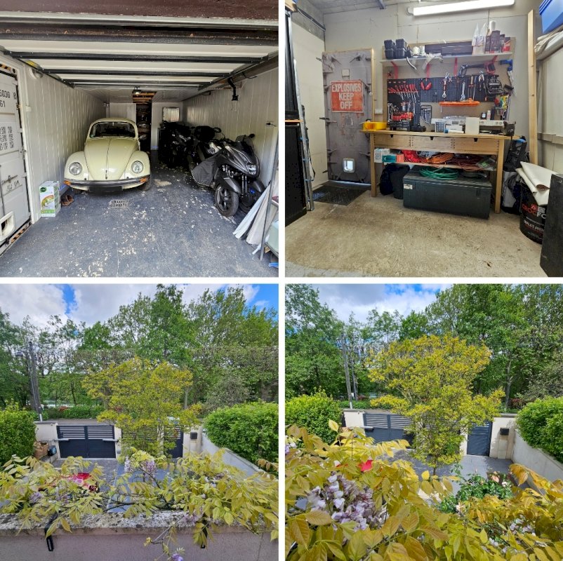 Cabanon en métal (qui reste) pour ranger tout l'outillage de jardin.