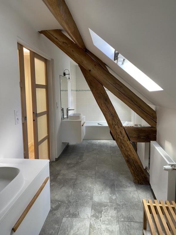 1er étage desservit par un charmant escalier en bois : un palier, couloir, 3 chambres, wc et salle de bain double avec 2 fenêtres.