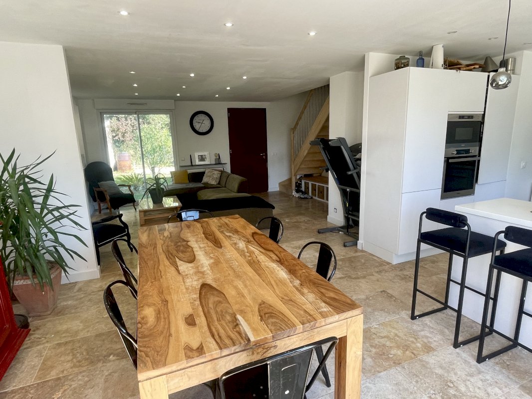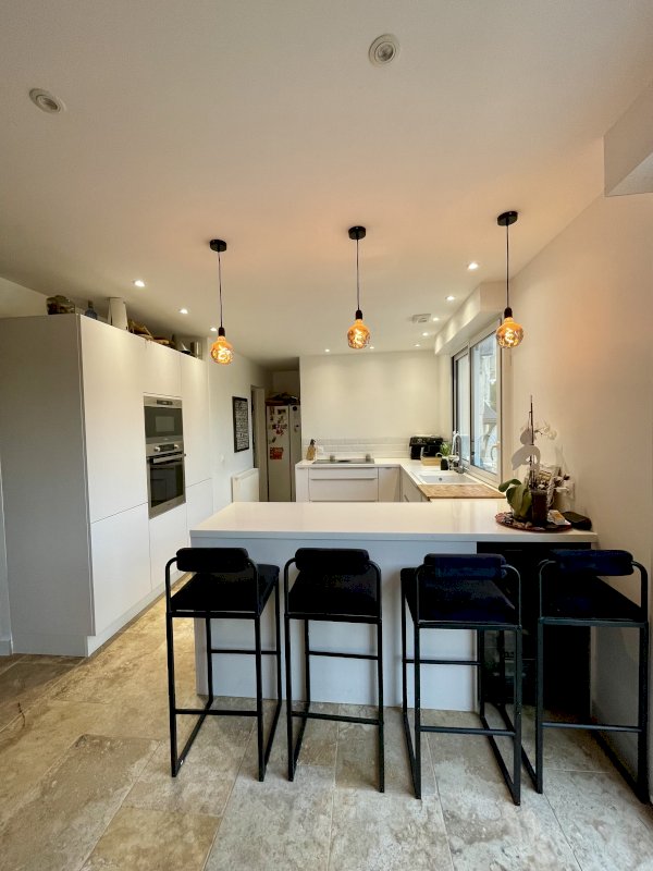 Une grande pièce de vie lumineuse de 65 m² regroupant la cuisine ouverte, la salle à manger et le salon, parfaite pour recevoir.