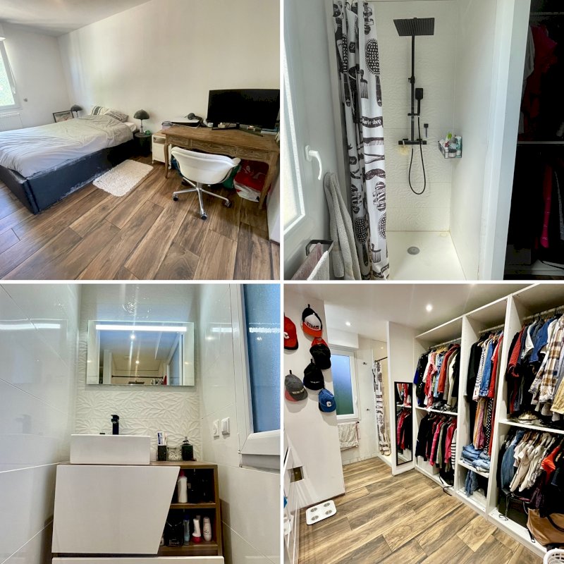 Une suite parentale de 25 m² avec un dressing de 9 m² et une salle d’eau attenante (douche, lavabo).