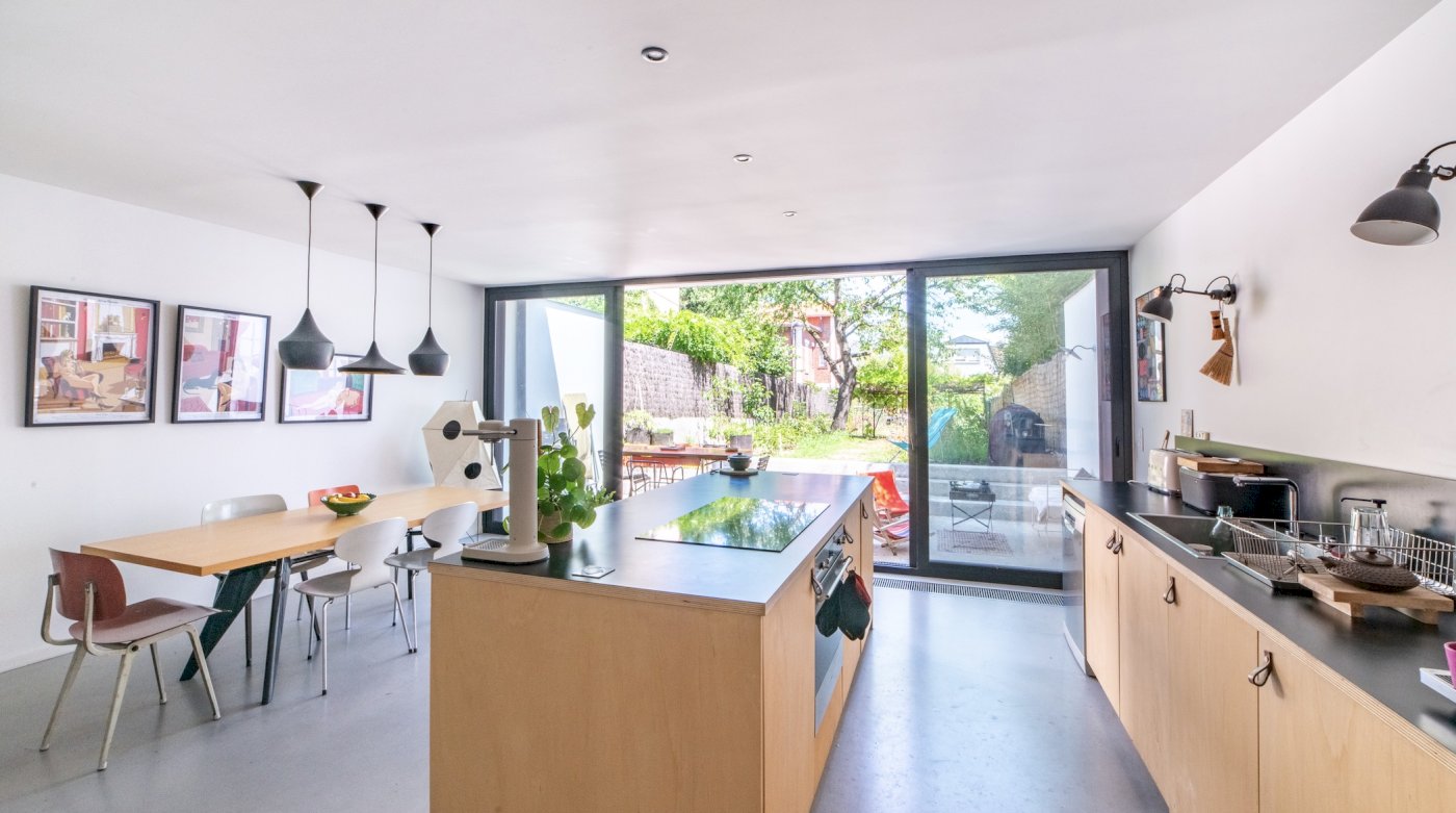 • Belle cuisine dînatoire ouverte de 31 m², baignée de lumière grâce à une large baie vitrée triple vitrage donnant sur le jardin.
