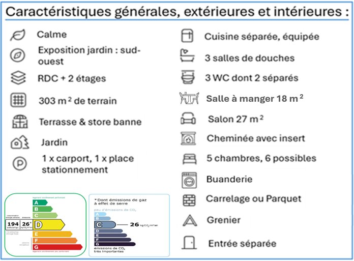 - Terrain : 303m² avec terrasse de 42m² (store banne motorisé), carport fermé, garage à vélos, abri de jardin (6m²).